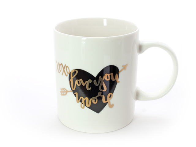 Tazas de cerámica con detalles en dorado y la leyenda XOXO LOVE YOU MORE