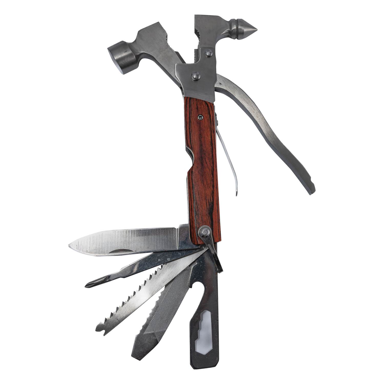 El martillo Multiuso contiene: alicates de punta plana, tornillo de banco, mini hacha, martillo, cortador previo, sierra de dos hileras, cuchillo, destornillador, destornillador plano, abrebotellas, cuchillo dentado, lima de uñas. Una herramienta para resolver todas sus necesidades